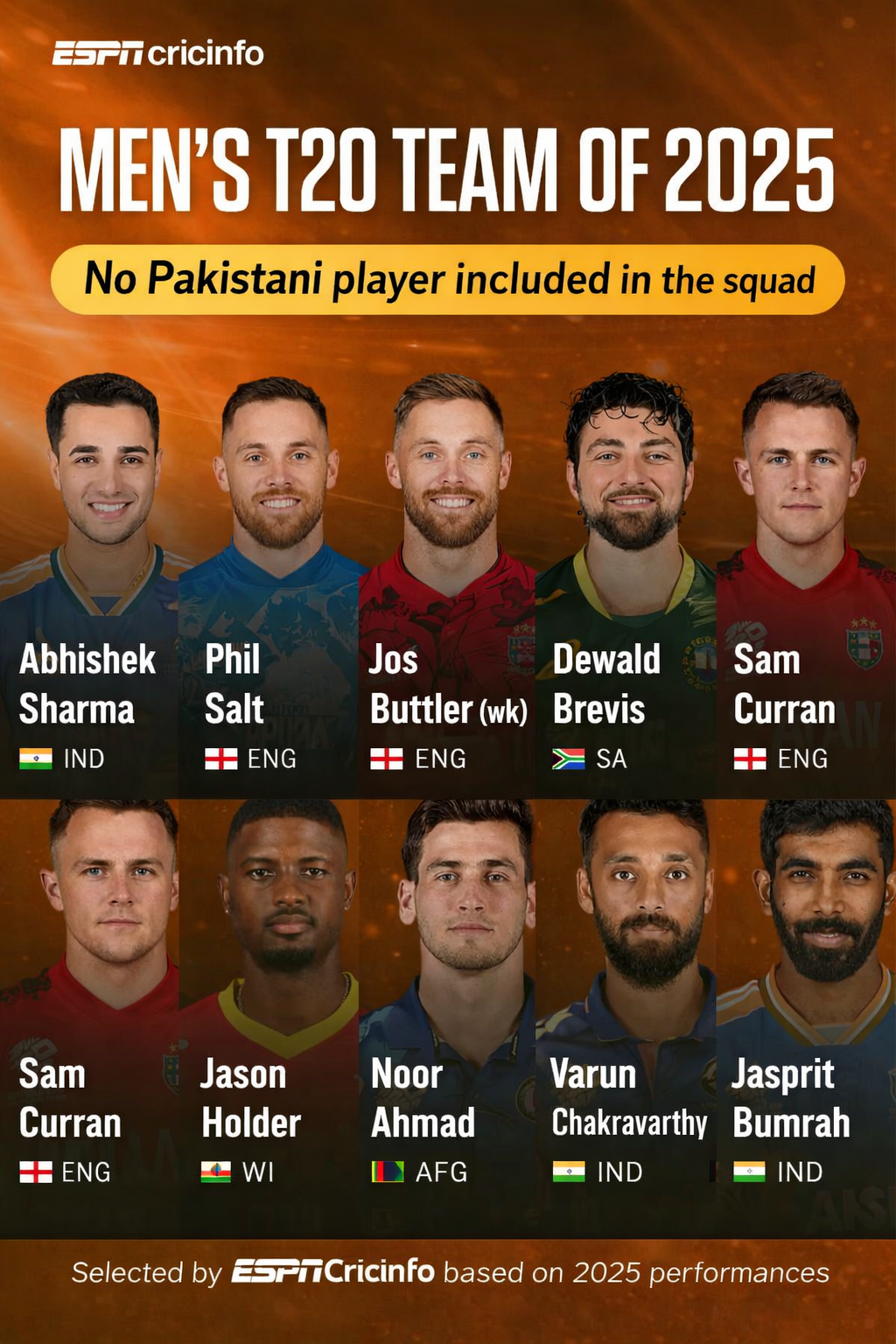 Men’s T20 Team of the Year 2025 revealed by ESPN Cricinfo. See full squad, key performers, and why no Pakistani player made the list.